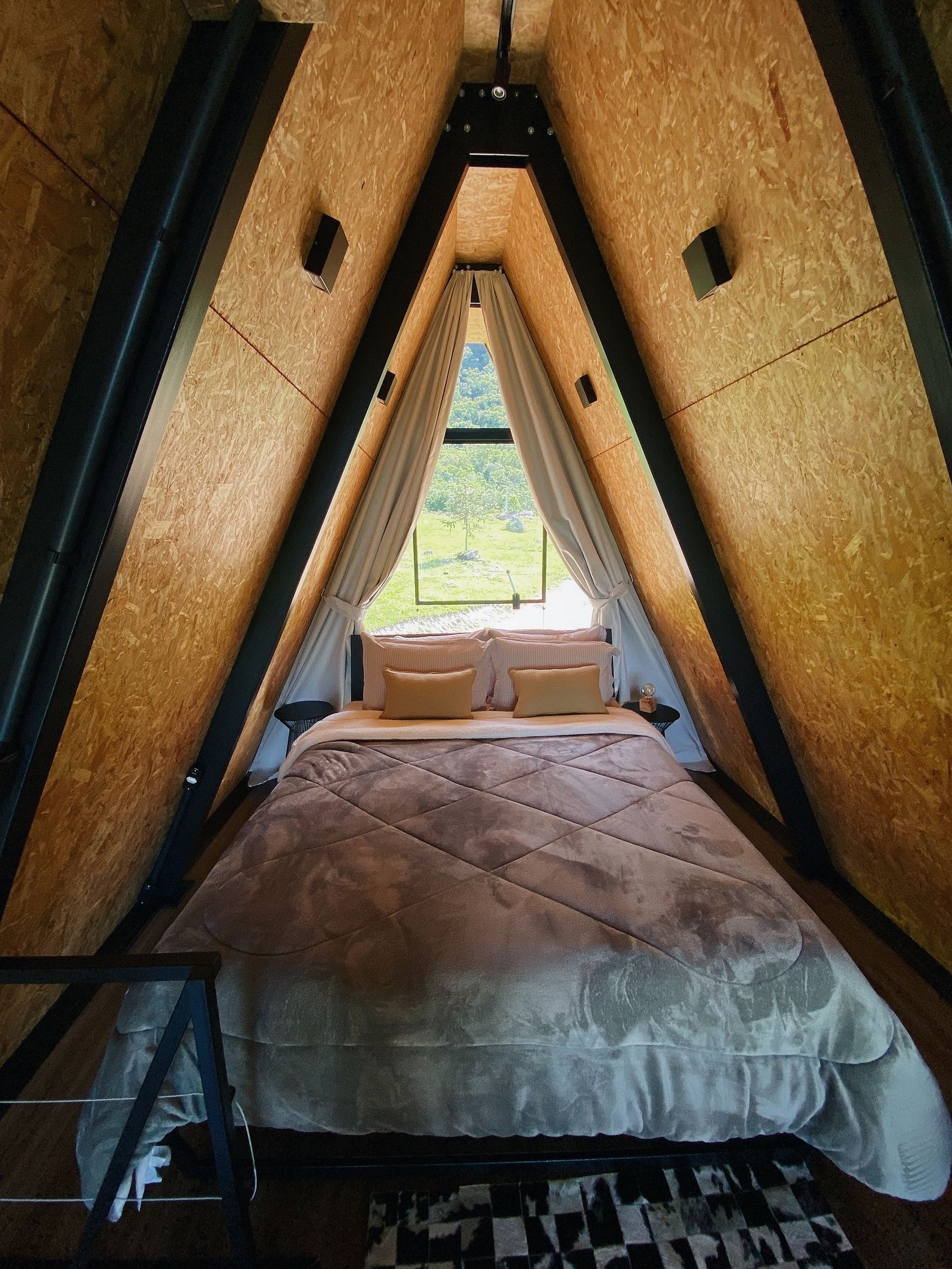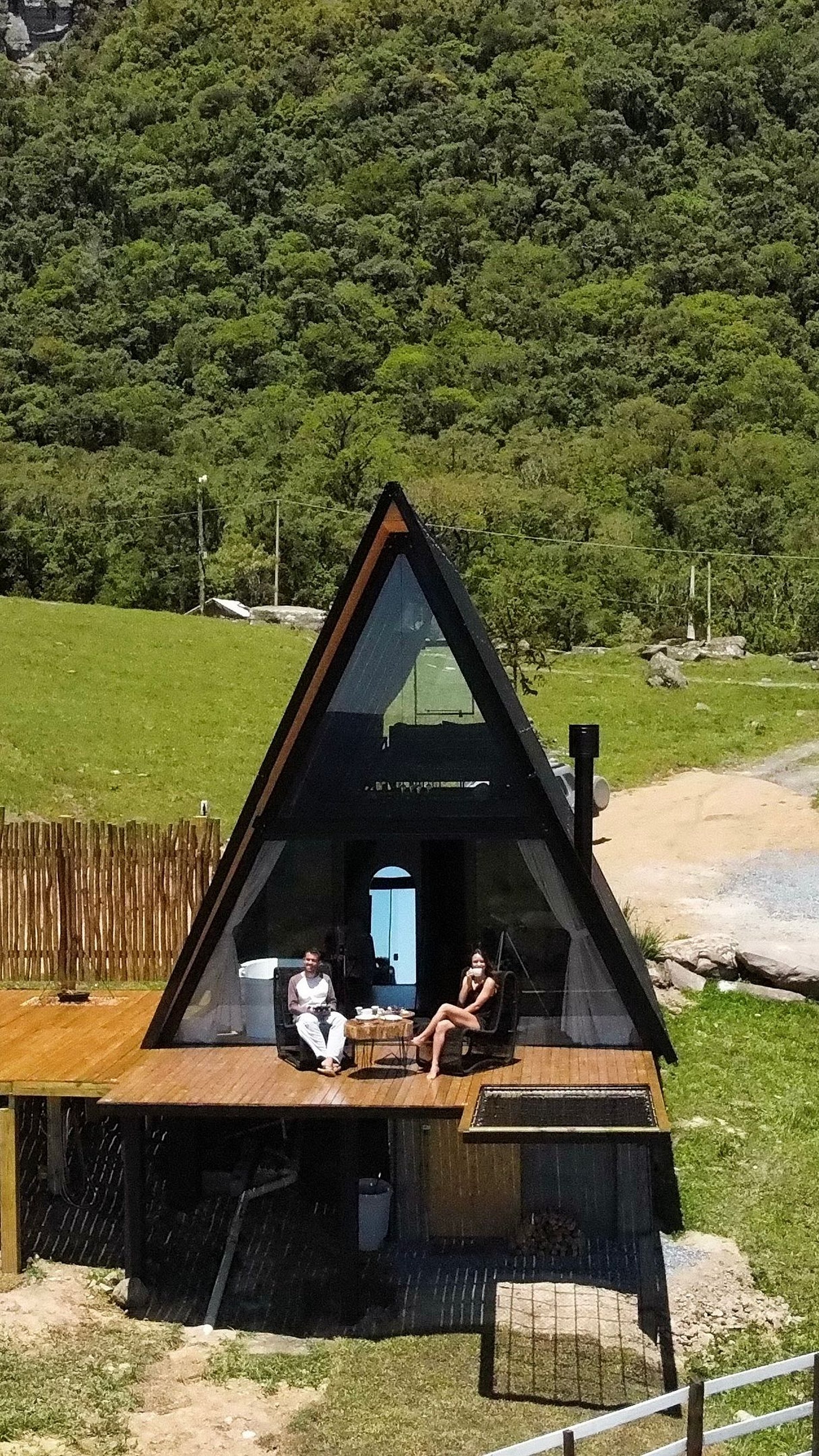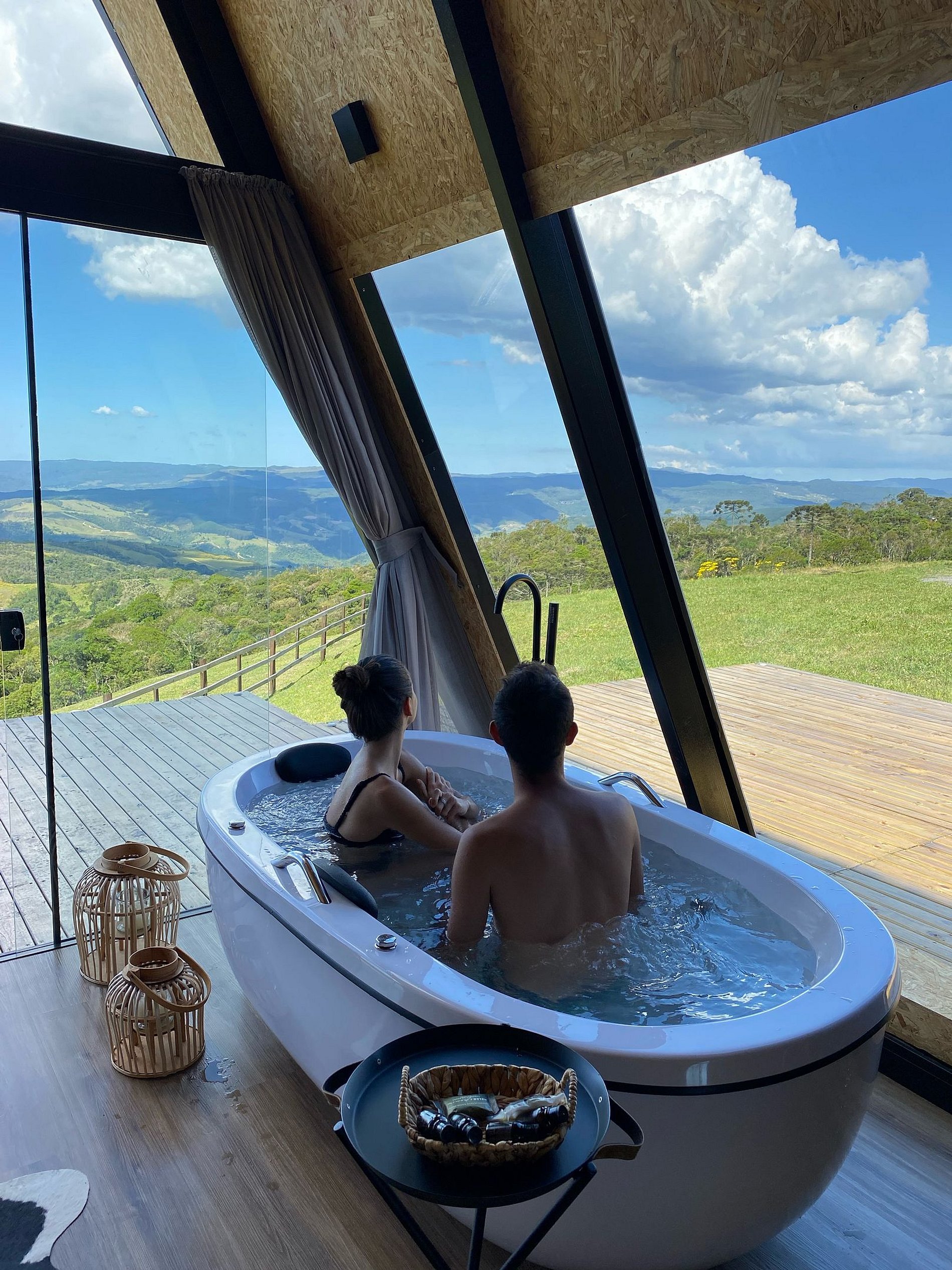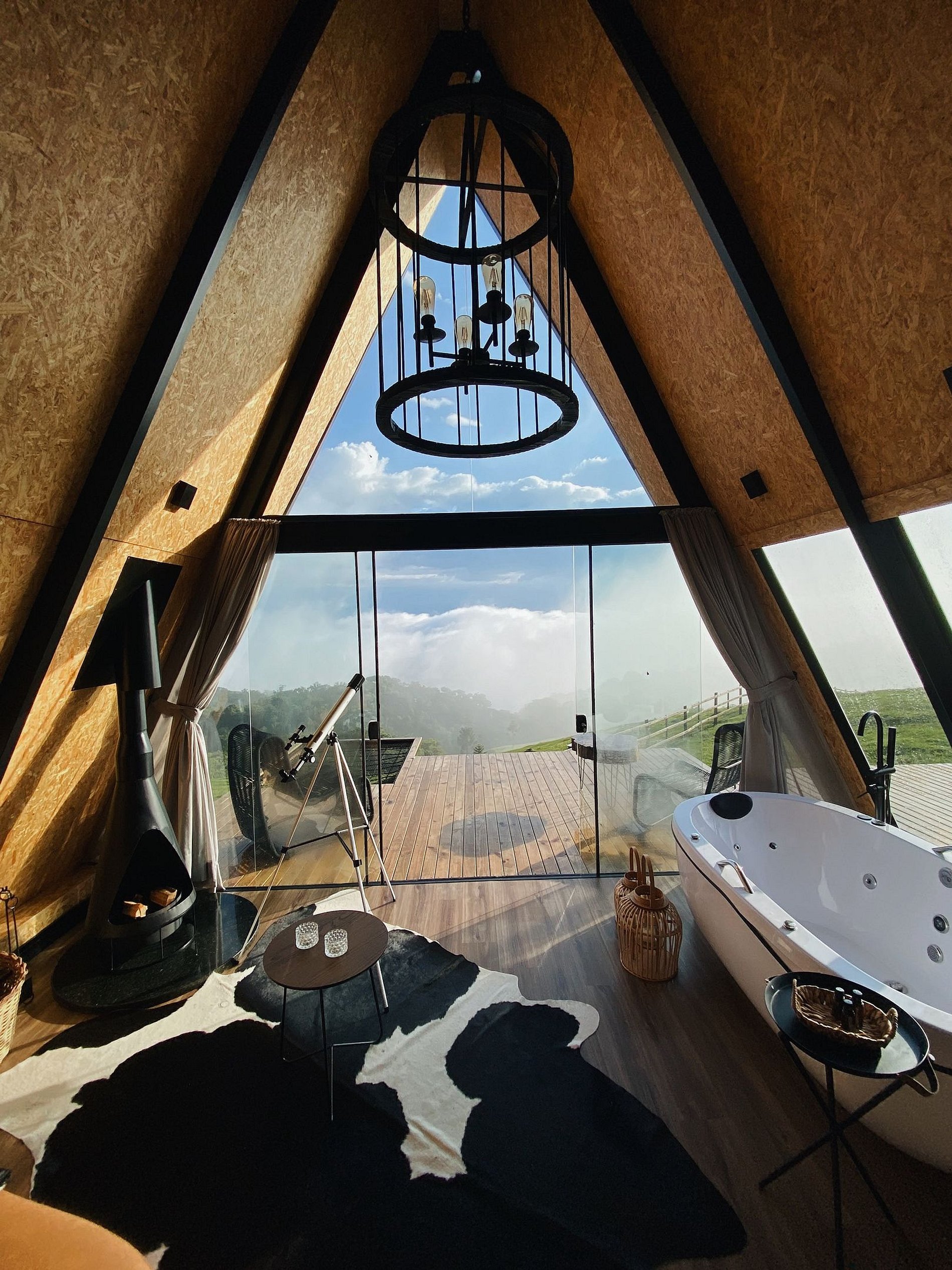 Com todo o charme que uma cabana Aframe remete e uma banheira de hidromassagem com cromoterapia na sala com uma vista deslumbrante.