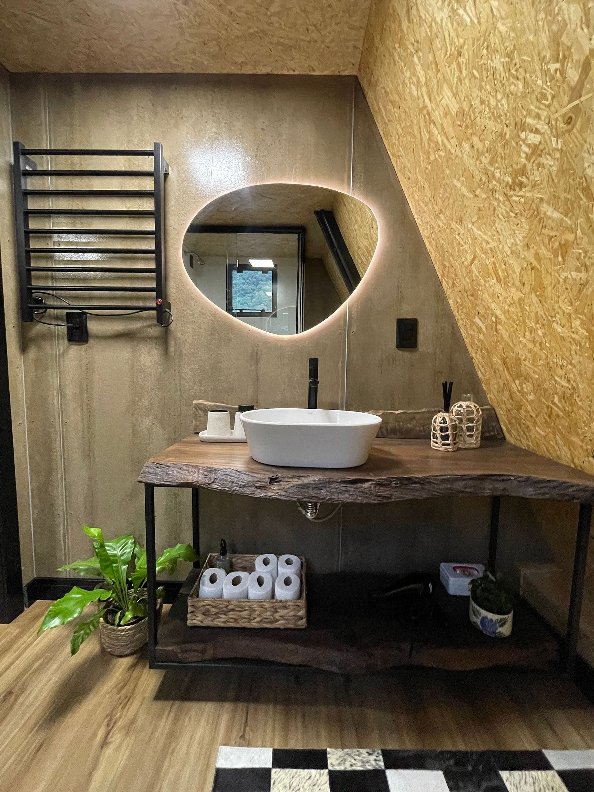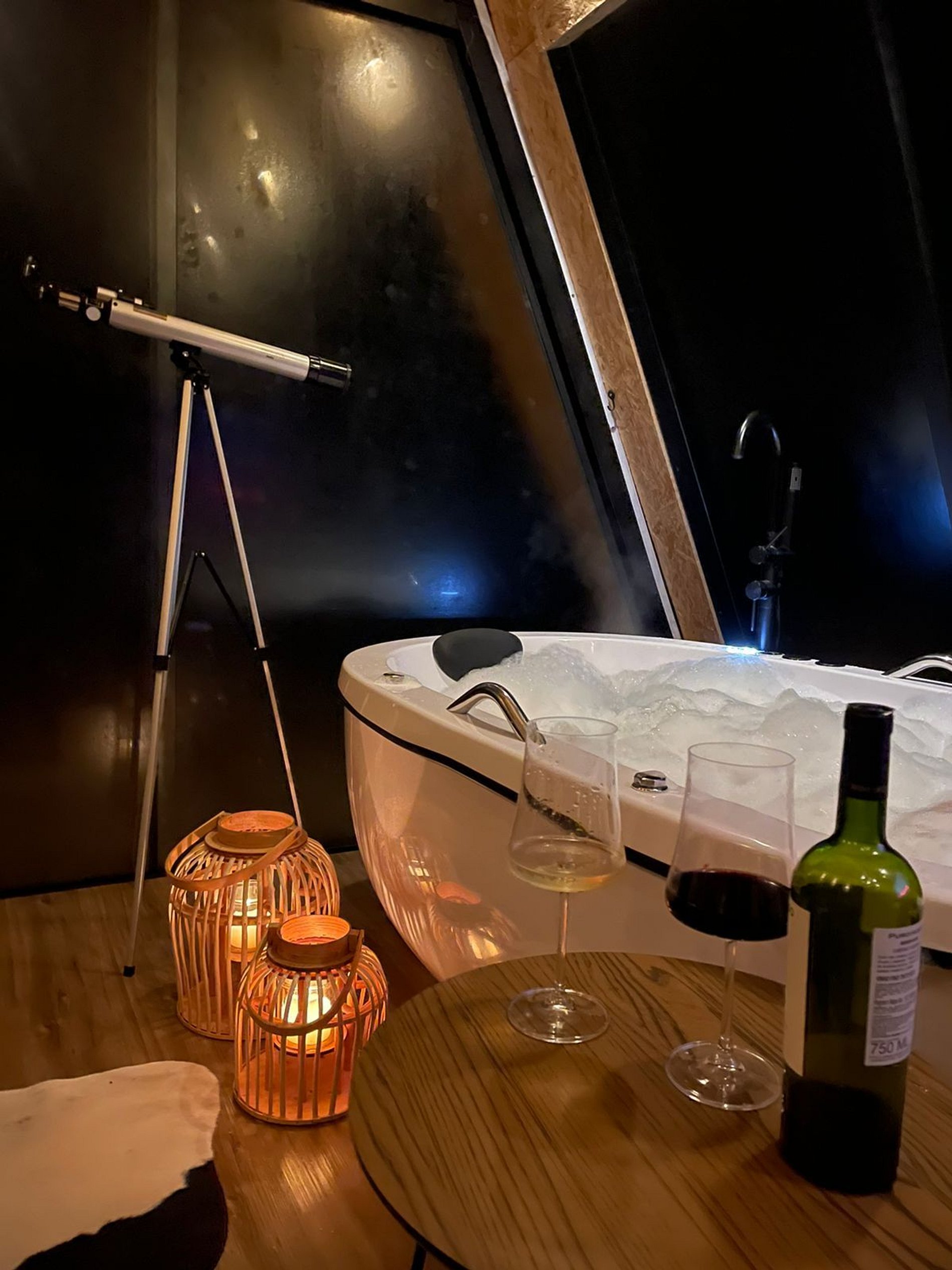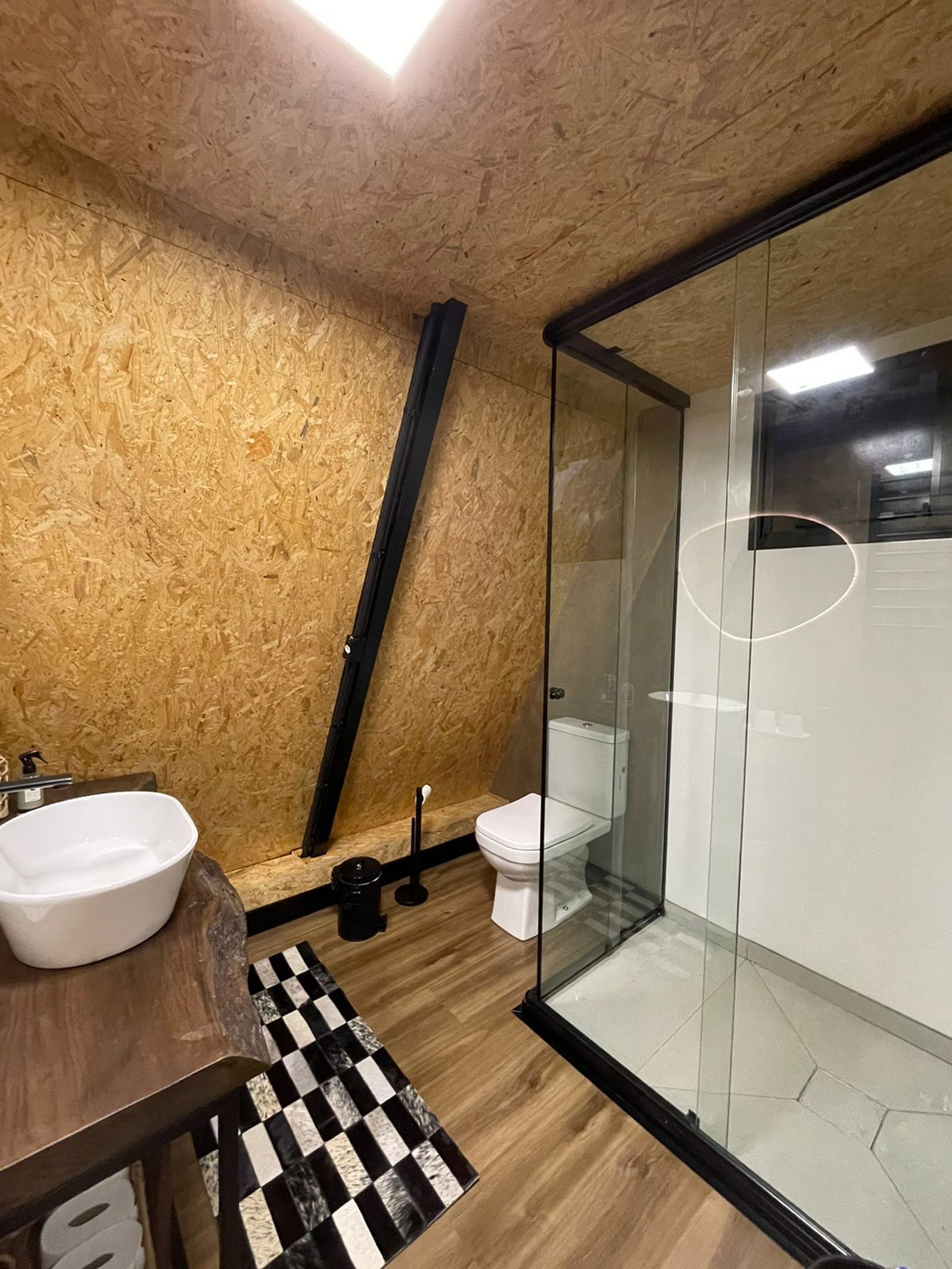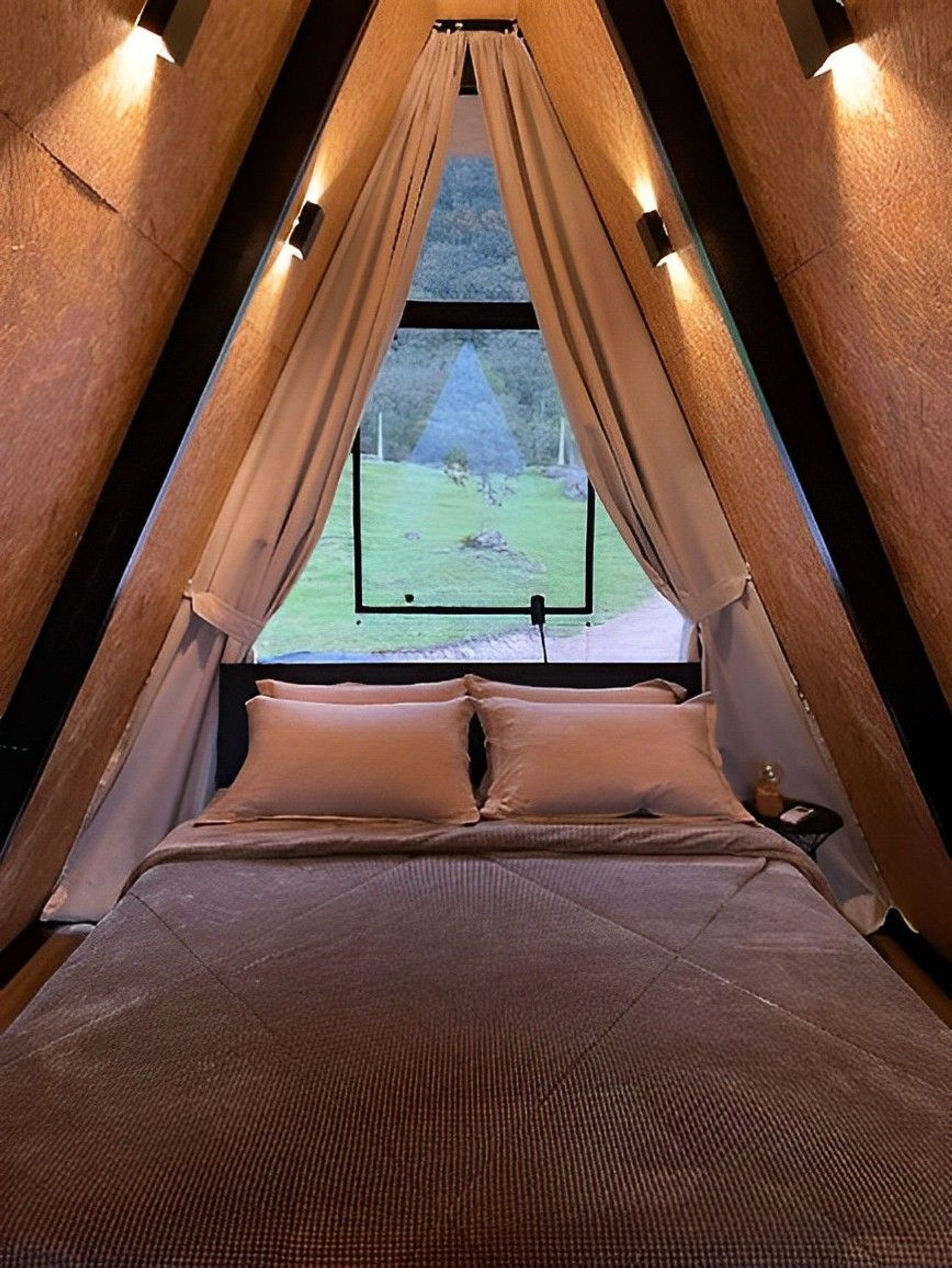 Com todo o charme que uma cabana Aframe remete e uma banheira de hidromassagem com cromoterapia na sala com uma vista deslumbrante.